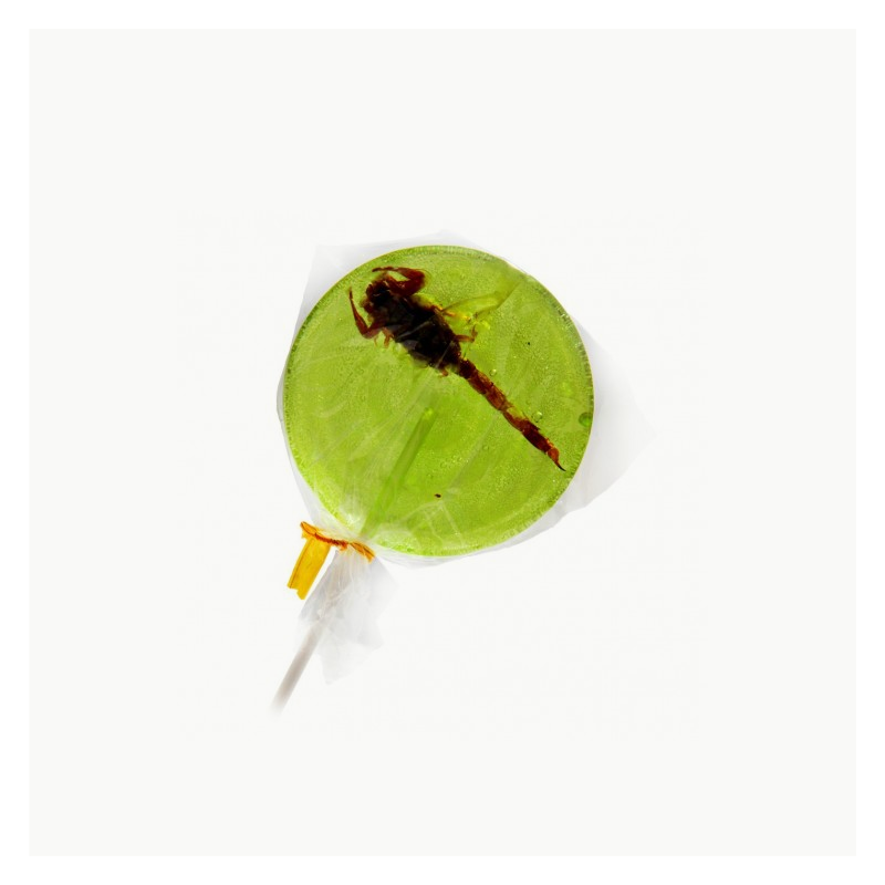 ¡ Es una revolución en el universo de los gustos y de los sabores! La chupete de manzana con escorpión. Entonces, atrévase a probar el sabor de los insectos.