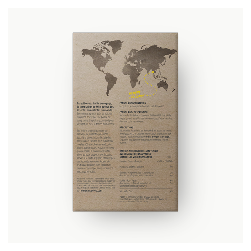 Los grillos de la marca Insectéo han sido seleccionados por su sabor y sus condiciones óptimas de crecimiento en Tailandia. Con su gusto natural de nuez y su textura crujiente, estos insectos se mezclan perfectamente con el sabor del curry.